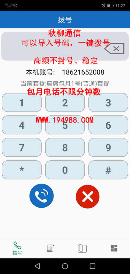 A1.APP包月,在全國用:打市話和長途,免高頻封號,顯示本機號碼,移動手機卡自備。可以導入號碼,一鍵撥號。包月費每月XXX元,安卓手機裝APP軟件就可以。每天限制撥打300次,通話時長不限。(APP軟件使用前要刷臉實名)。